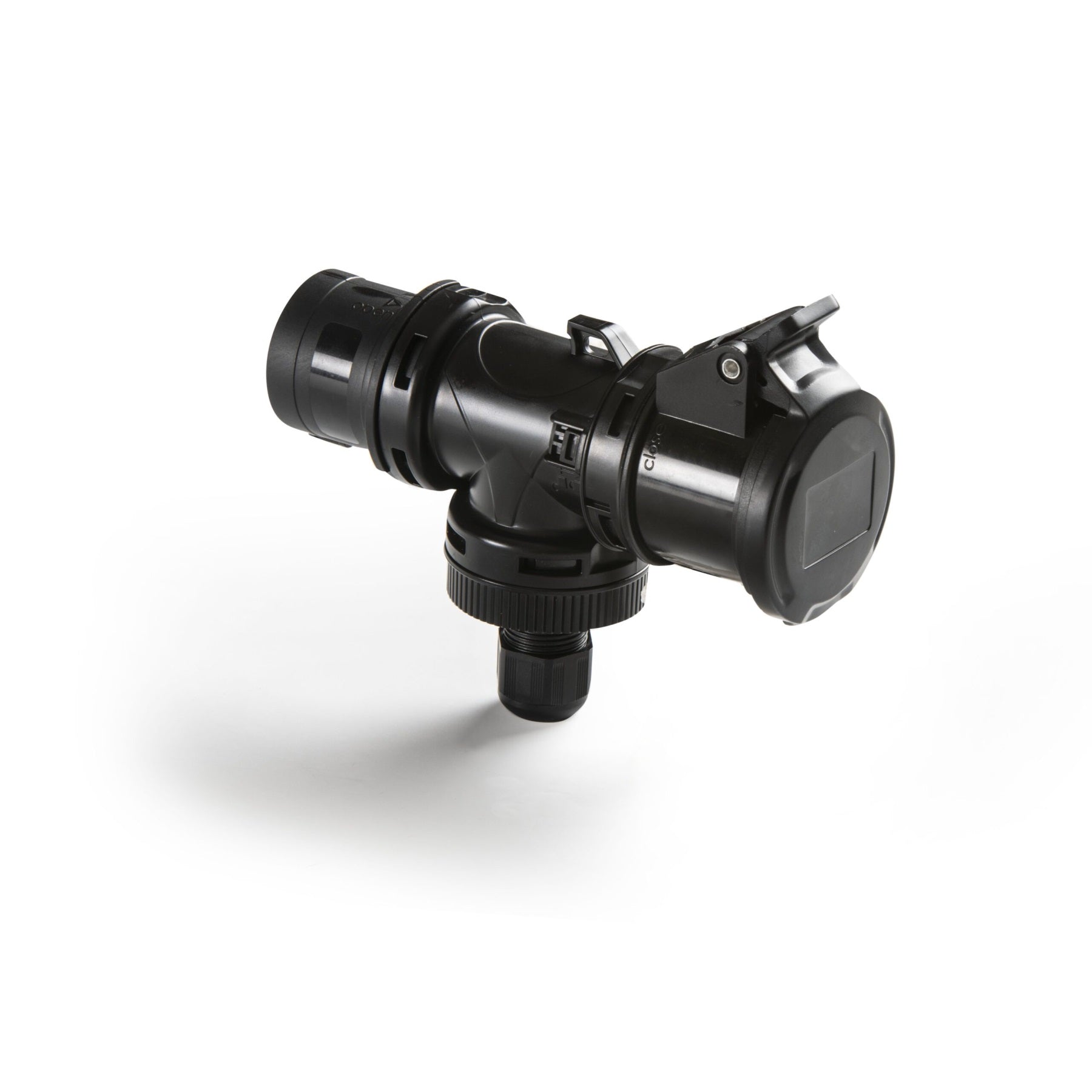 Famatel t-power 1 x 16a 2p+e 6h 240v plug to 1 x 16a 2p+e 6h coupler c/w 1 gland ip65 black