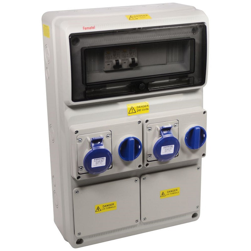 Famatel 18th Edition Caravan Hook Up 2 x 16A 2P+E Switched Interlocked Outlet c/w 2 x 16A DP 30mA RCBO - NEWCAV2 Part No ...